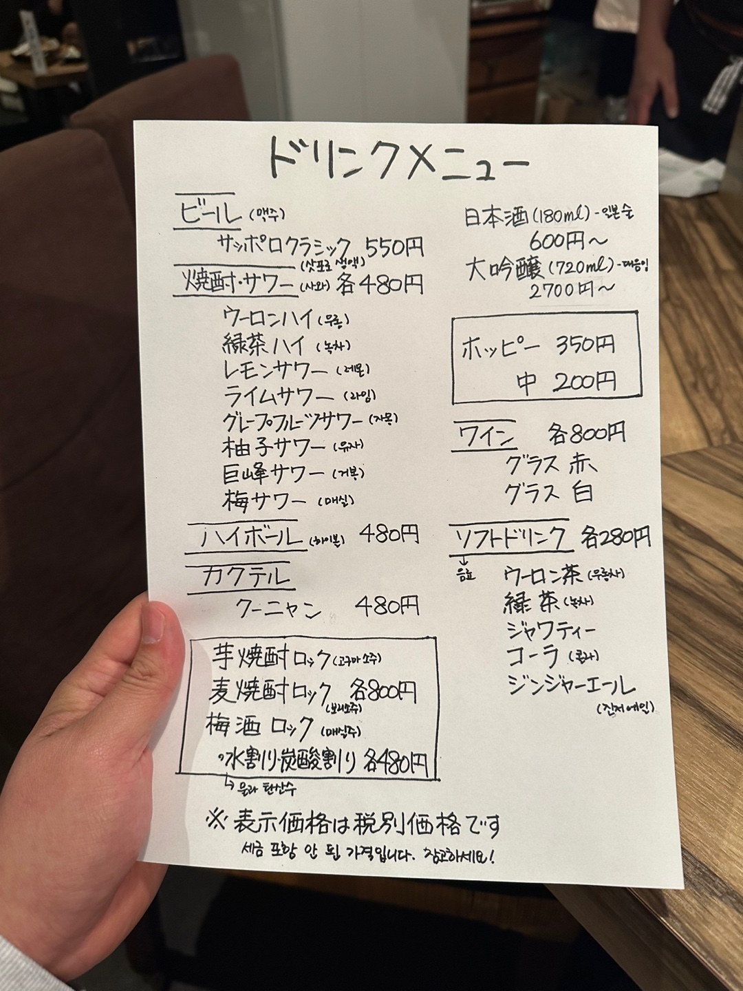 A4용지에 술이 일본어와 한국어로 적혀있습니다!